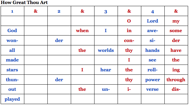 First let’s look at a few classic hymns that are written in 4/4 time, meaning each measure in the song has four beats in it. Syllables in blue occur directly on the beats, which are indicated by the numbers 1, 2, 3, and 4. Syllables in red occur on off-beats, which are indicated by the “and” symbols.